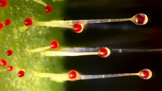 Το φυτό Δροσέρα εύστοχα ονομάστηκε έτσι. Κάθε φύλλο καλύπτεται με μικροσκοπικά τριχοειδή-πλοκάμια, στην άκρη των οποίων υπάρχει μια δροσοσταλίδα που μοιάζει με πρωινή δροσιά. Αυτά, τα σταγονίδια που λαμποκοπούν στον ήλιο, κρύβουν προσεκτικά και μια παγίδα.Αυτό που μοιάζει με δροσοσταλίδα είναι στην πραγματικότητα μια κολλώδης ουσία, ώστε κάθε έντομο, που προσγειώνεται πάνω σε ένα φύλλο Δροσέρας να βρεθεί αμέσως κολλημένο. Καθώς αγωνίζεται να ξεφύγει, τα πλοκάμια και τα φύλλα του φυτού μπερδεύονται γύρω από το έντομο και το σαρκοβόρο φυτό χωνεύει σιγά-σιγά το θήραμά του.